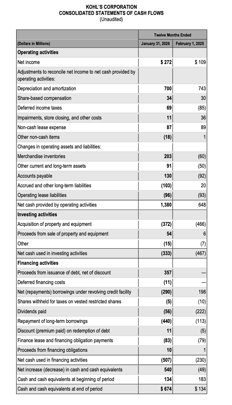Michael J. Bender, Kohl’s Chief Executive Officer, said, “We are ending 2025 in a stronger position than we started, with important work still ahead of us. Over the past year, our efforts have been focused on resetting our foundation. This focus is intended to stabilize the business and strengthen our operational ability to build for a stronger future. In 2025, we made meaningful progress, despite our Q4 topline coming in softer than our expectations. We were able to manage the business with discipline, deliver improved earnings, and generate meaningful cash flow, all of which helped us strengthen our balance sheet.”