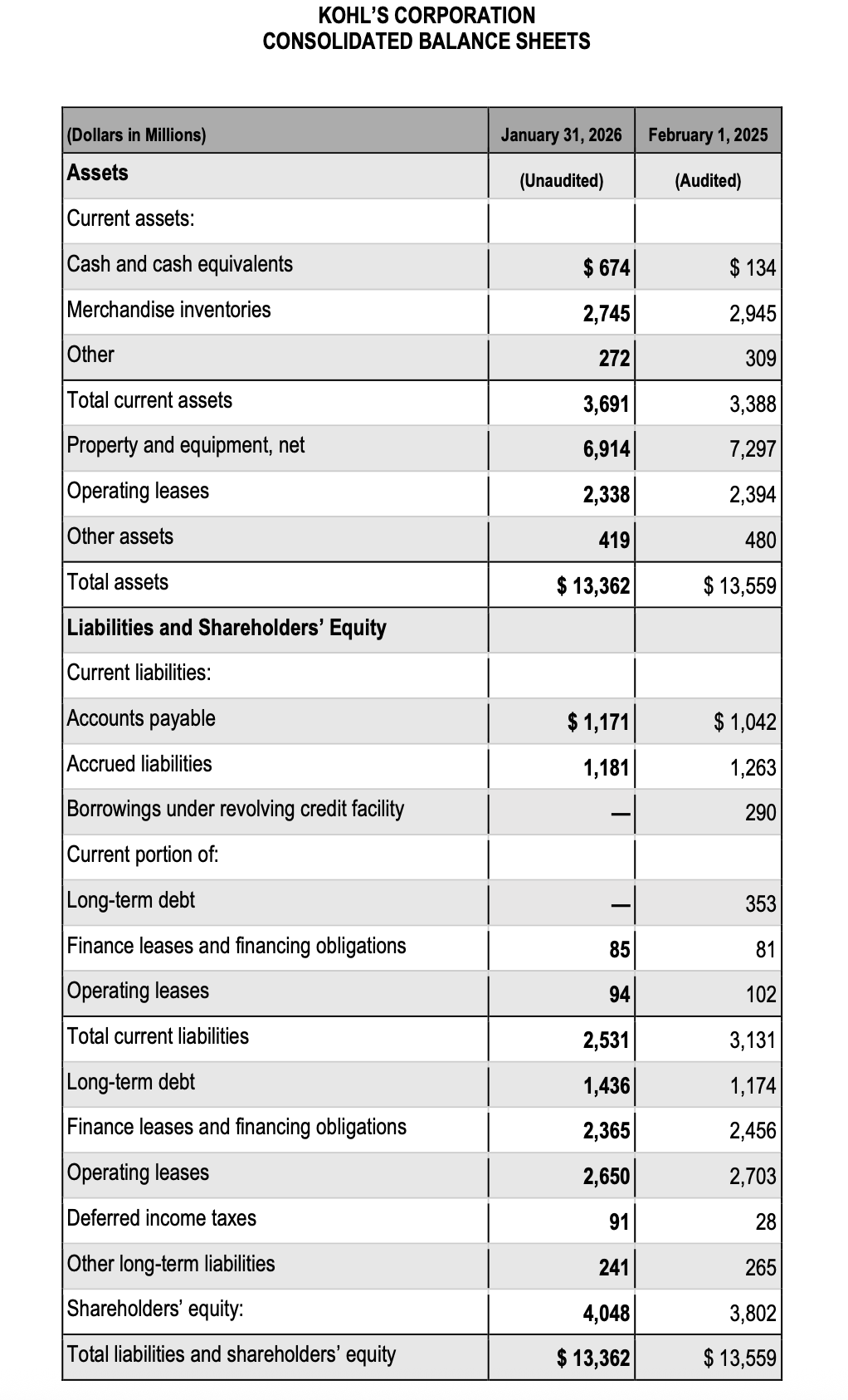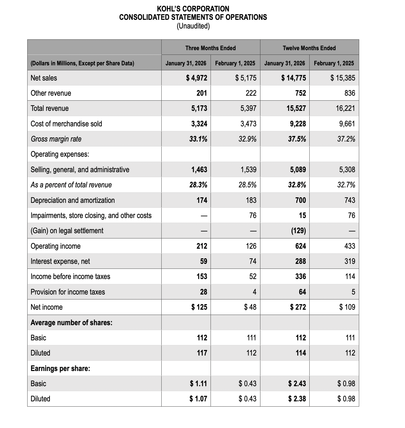 MENOMONEE FALLS, Wis.—(BUSINESS WIRE)—March 10, 2026—Kohl’s Corporation [NYSE:KSS] (“Kohl’s” or the “Company”) today reported results for the quarter and year ended January 31, 2026.